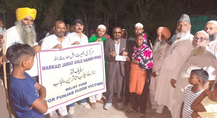مرکزی جمعیت اہل حدیث ہند کے امیر محترم مولانا اصغرعلی امام مہدی سلفی کی قیادت میں ناظم مالیات الحاج وکیل پرویز ، مولانا محمد رئیس فیضی ، صوبائی جمعیت اہل حدیث پنجاب کے ذمہ داران واراکین خصوصا جناب عرفان انجم خازن صوبائی جمعیت اہل حدیث پنجاب، مکرم سیفی،مولانا خبیب ندوی، محمد شاہدوغیرہ پر مشتمل ایک اعلیٰ سطحی راحتی وفد نے مورخہ ۲۳؍ستمبر ۲۰۲۵ء کو پنجاب کے مختلف سیلاب زدہ مقامات کا دورہ کیا۔ متاثرین سے ملاقاتیں کیں، حالات کا جائزہ لیا اور متاثرین کے درمیان نقد ریلیف تقسیم کی۔یہ جانکاری مرکزی جمعیت اہل حدیث ہند سے جاری ایک پریس ریلیز میں دی گئی۔